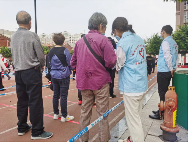 随着检测群众陆续进场,圣元环保志愿者明确分工后,主动分散到各区域,或严肃维护排队秩序,引导黄码、绿码人员分列排队;或耐心为老年人解答疑惑,安抚其情绪;或频繁提醒检测人群保持一米距离,及时疏散完成检测的群众。一抹抹“圣元蓝”在骄阳下分外耀眼。