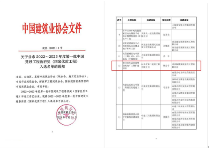 1月11日,中国建筑业协会公布2022-2023年度第一批中国建设工程鲁班奖(国家优质工程)入选名单,圣元环保莆田市生活垃圾焚烧发电厂三期扩建项目荣获中国建筑行业工程质量最高荣誉——中国建设工程鲁班奖(国家优质工程)。