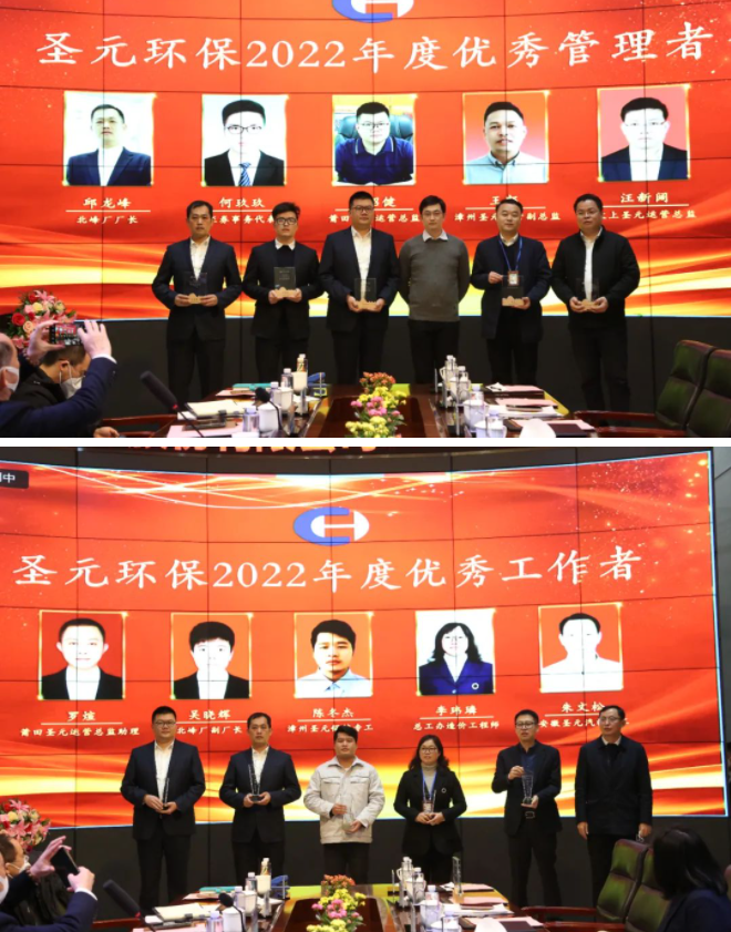 会议还对圣元环保2022年度优秀管理者、优秀工作者进行表彰,弘扬先进、树立典范。其中邱龙峰、何玖玖、孔昭健、王郎、汪新阔荣膺“优秀管理者”;罗煊、吴晓辉、陈冬杰、李玮璘、朱文松获评“优秀工作者”。