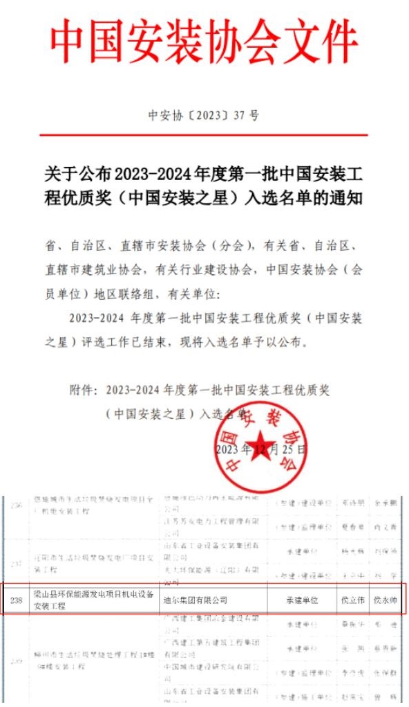 2023年12月25日,中国安装协会正式公布2023-2024年度第一批中国安装工程优质奖(中国安装之星)入选名单,迪尔集团承建的梁山县环保能源发电项目成功入围,成为2023-2024年度首批“中国安装之星”。