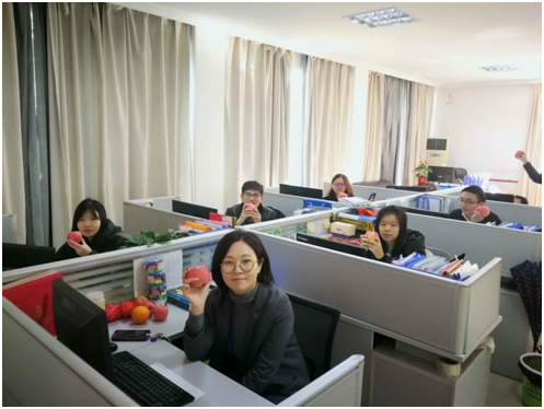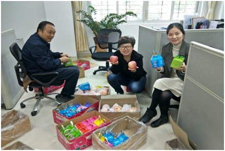 南安圣元人事行政部成员仔细挑选苹果并装袋