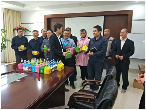 南安圣元常务副总经理杨煌坤为员工们发放平安果