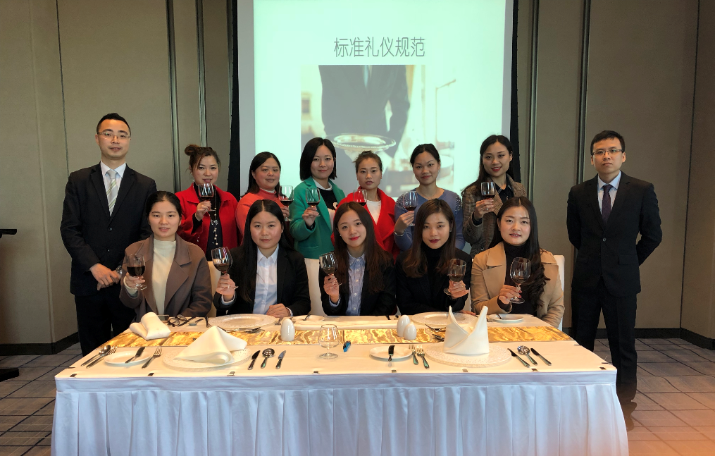 在实操环节,授课老师安排了丰富、生动、活泼的实操内容,主要有会议布置、西餐礼仪、中餐礼仪、咖啡调制、红酒品鉴等,参训人员听得津津有味。