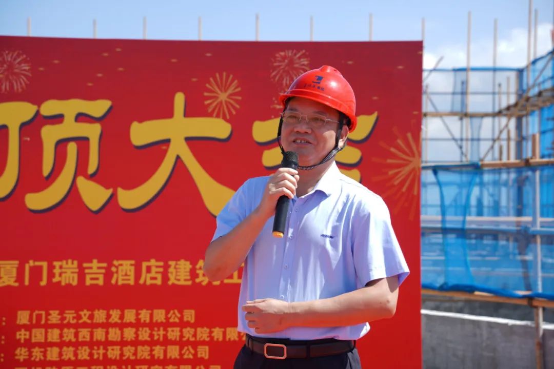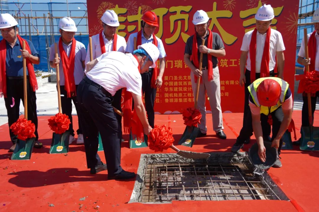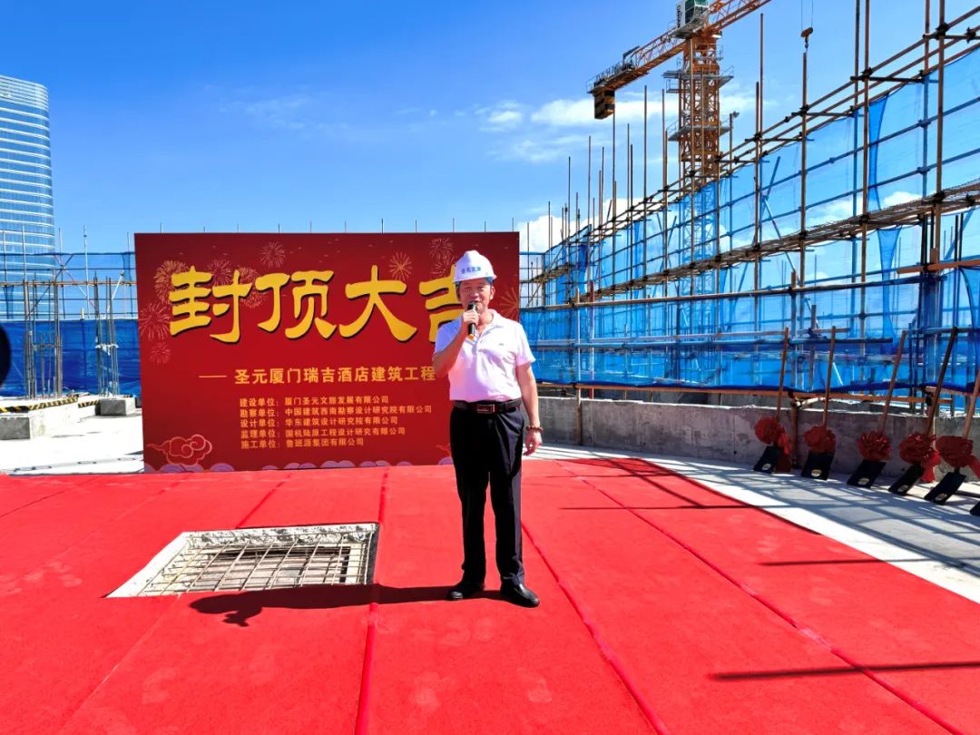 封顶仪式在酒店T2塔楼屋面隆重举行。圣元环保董事长朱煜煊、鲁班源集团董事长白春杨、国际陆原总监刘元周、项目设计方澳洲AW设计开云网页版页面登录合伙人杨朝闵、幕墙顾问厦门锐建总经理赵志刚、圣元厦门瑞吉酒店项目总指挥朱鑫强等嘉宾及参建单位相关人员共同出席。
